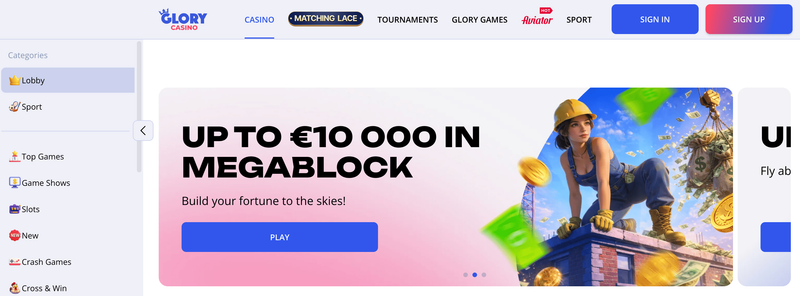 On the Glory Casino website, you can play demo or real-money versions of top-rated slots, table games, card games, live dealer games, crash games, and even place bets on sports.